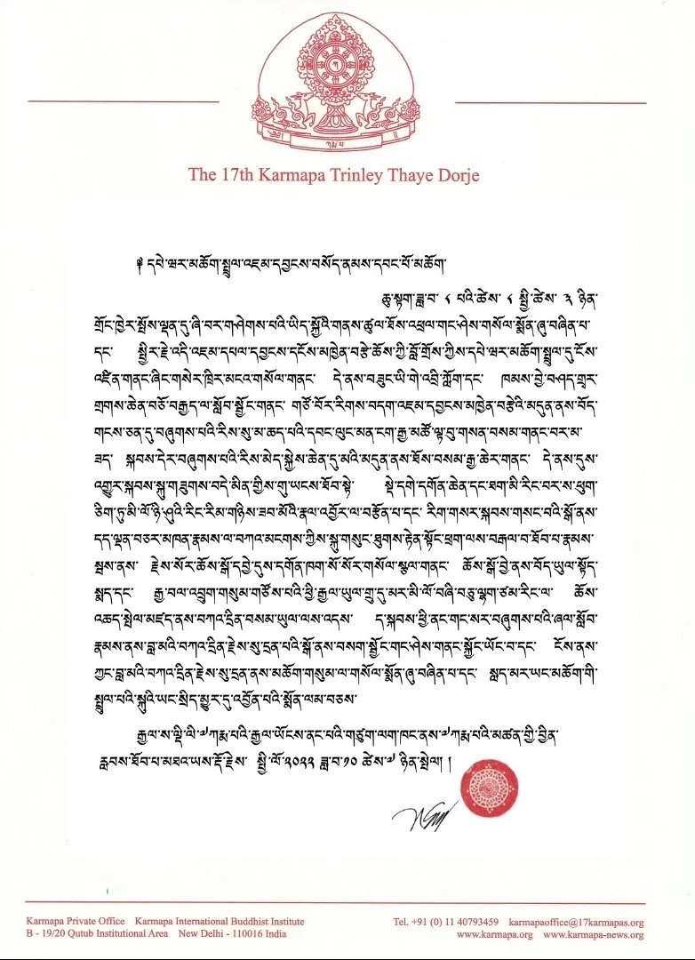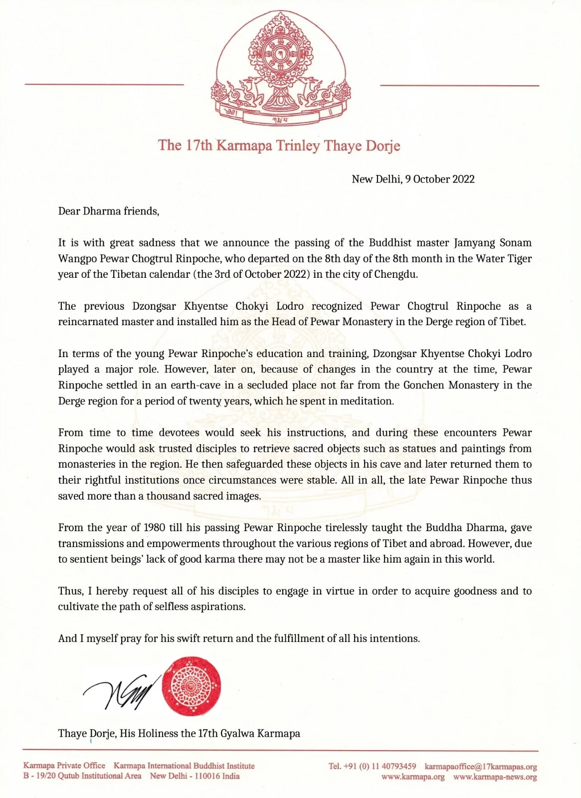 Thayé Dorjé, Sa Sainteté le XVIIe Gyalwa Karmapa, partage le message suivant au sujet du décès de Pewar Rinpoché.